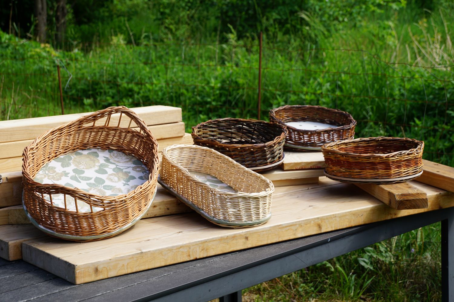Vi odlar vår egen pil, och vi har 11 olika sorter. I december/januari skördar vi pilen genom att klippa ner den till höfthöjd. Vi håller sorterna separerade och sorterar efter storlek. Varje sort har sin egen färg, styrka och flexibilitet.